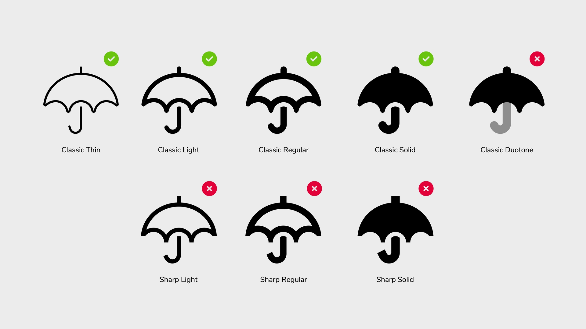 Für unsere Ikonografie greifen wir auf 4 Stylesets des Font Awesome Icon Pools zurück. Auch wenn sie auf identischen Entwürfen basieren, sollten die 4 Stylesets nicht gemischt werden. Eine Übersicht aller verfügbaren Icons findest Du hier.